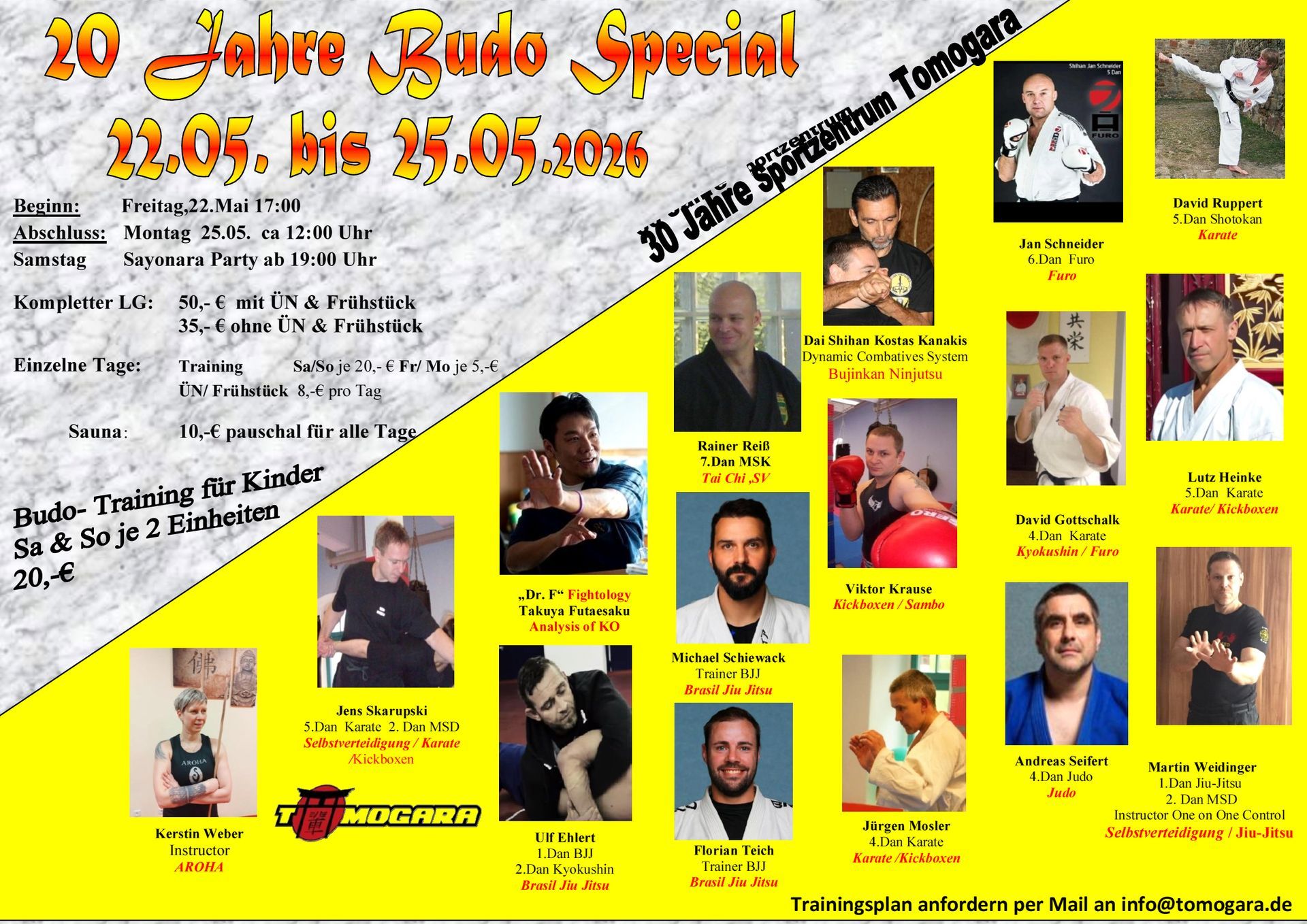 Anlässlich des 20. Jubiläums unseres Budo-Specials haben wieder hochkarätige Trainer aus den verschiedensten Kampfkünsten ihre Teilnahme zugesagt. Wir möchten daher ein T-Shirt, ähnlich der untenstehenden Vorlage erstellen und drucken lassen. Die Shirts sollen mit Namen individualisiert werden.