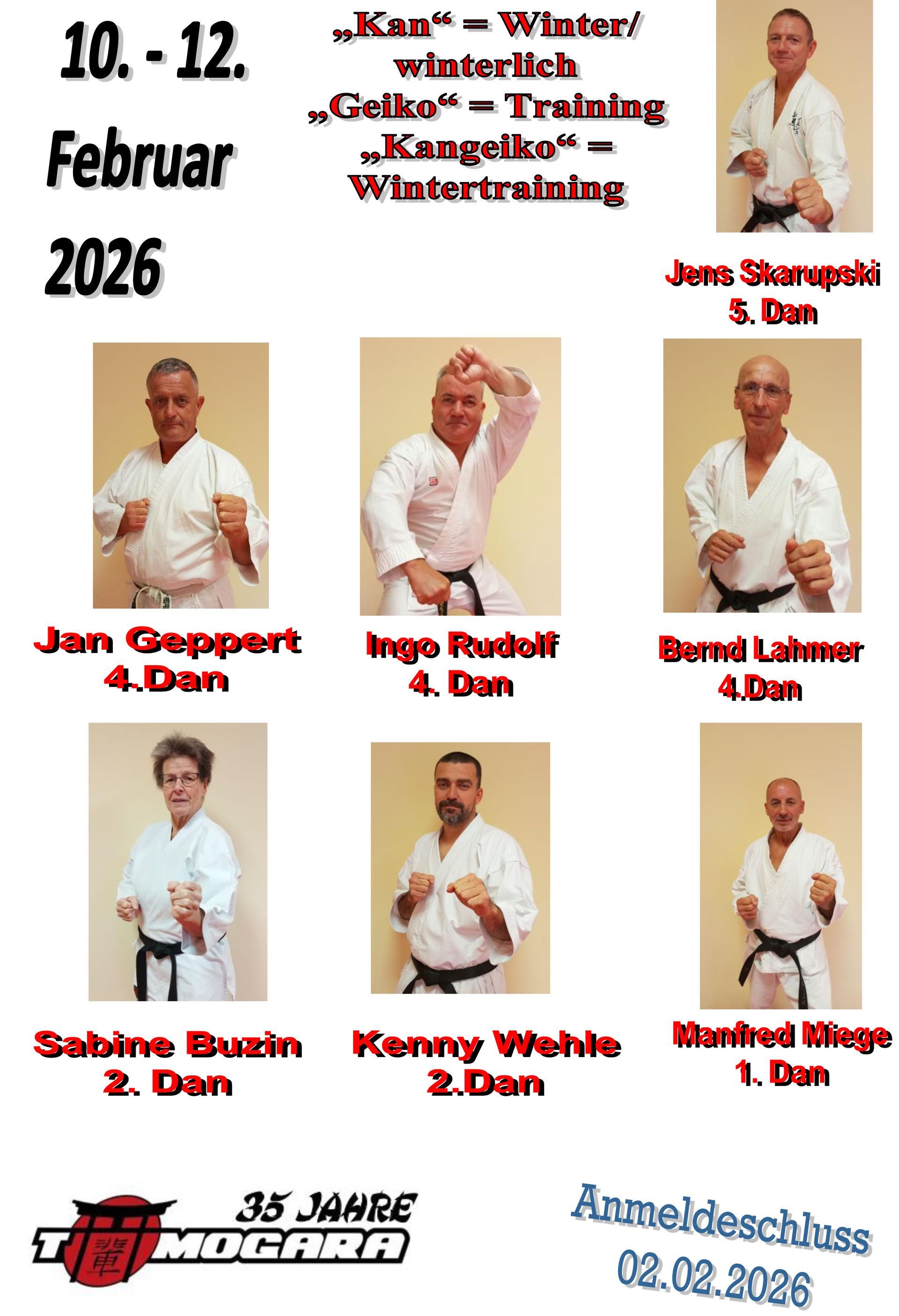 Im Rahmen der Dan-Vorbereitung unserer Prüflinge für das Shotokan Event 2026 in Kamenz, reisten 14 Prüflinge und Trainer zu einem speziellen Lehrgang nach Mendig. Unter dem Motto „Karate ist Selbstverteidigung“ lud der Rheinland-Pfälzische Karateverband zu einem Seminar mit Gunar Weichert (8. Dan ), Klaus Sterba (9. Dan) und Jürgen Kestner (8. Dan und SV-Spezialist in der Polizei-Ausbildung) ein. Die Verbindung von Kihon (dem Training umfangreicher koordinativer und konditioneller Fähigkeiten), der Kata (traditionelle Bewegungsformen der Verteidigung) und die Anpassung der Techniken an die Anforderungen moderner Selbstverteidigung gaben einen enormen Input für die Vorbereitung der Aspiranten von Tomogara für ihre Prüfungskata. Besonders die zwei Stunden Feinschliff nach dem eigentlichen Lehrgang mit Meister Sterba und Weichert machten die knapp 600 km Anreise lohnenswert.